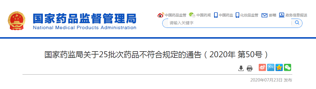 7月23日,國(guó)家藥監(jiān)局發(fā)布了關(guān)于25批次藥品不符合規(guī)定的通告,有14家藥品生產(chǎn)企業(yè)生產(chǎn)的25批次藥品不符合規(guī)定。