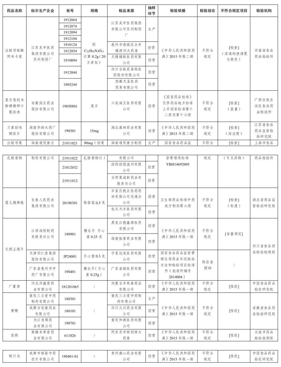 經(jīng)河南省食品藥品檢驗(yàn)所等9家藥品檢驗(yàn)機(jī)構(gòu)檢驗(yàn),標(biāo)示為江蘇吳中醫(yī)藥集團(tuán)有限公司蘇州制藥廠等14家藥品生產(chǎn)企業(yè)生產(chǎn)的25批次藥品不符合規(guī)定?,F(xiàn)將相關(guān)情況通告如下: