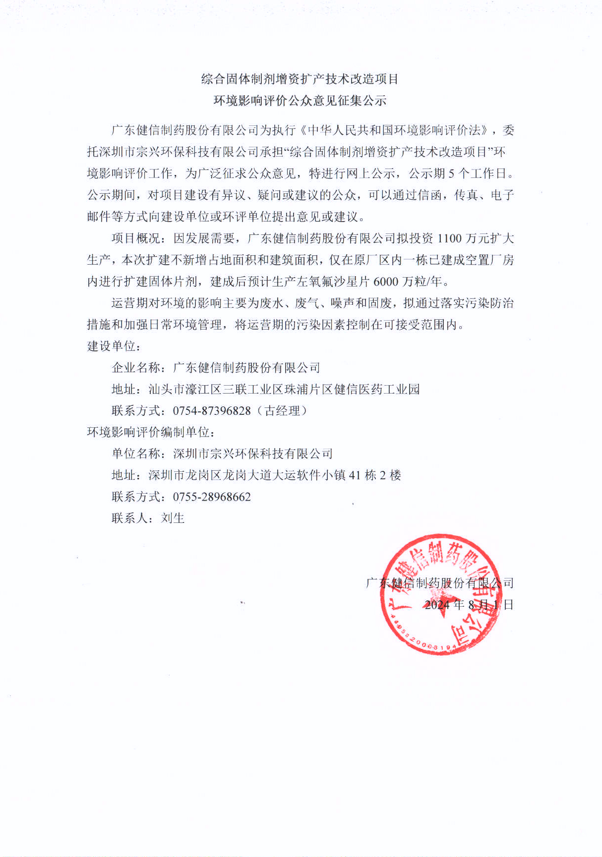 綜合固體制劑增資擴(kuò)產(chǎn)技術(shù)改造項(xiàng)目 環(huán)境影響評(píng)價(jià)公眾意見(jiàn)